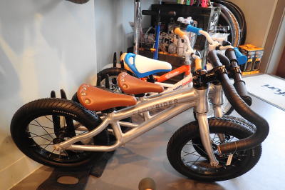 お店のガレージにあるモーターサイクル、自転車に一同興味津々。 自転車置き場に困らない、サイクリストに優しいお店です。