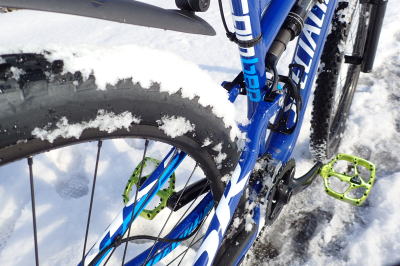 空気圧2.0barにセットした29in×2.3のグランドコントロール(スペシャライズド)で、残雪をザクザク走ります。 妻Bikeの空気圧は1.8barと若干低めにセット、前後のサスペンションを活かして雪遊びを存分に楽しみました。