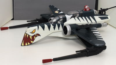 機体全体の基本デザインを踏襲しつつ、エンジンカウルが半円形状に変化。... ウイングを閉じた状態で、インテークが完全な円形となります。 ウイング形状も前後が半分にカットされ、ウイングを閉じると上下一体化されます。 モデル自体はフイギュアを載せる関係で、若干デフォルメされますが全体的に実機のイメージを上手く再現しています。 新型機を手にしてみると、改めて1977年版モデルの偉大さを実感。