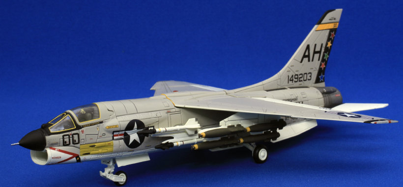 離着艦の際の機首上げ角を抑えるため、前桁に取り付けられた油圧アクチュエータと後桁のピボットによって、高翼配置の主翼の仰角を動かす唯一のシステムを持つ。F-8はベトナム戦争に投入。ミサイル万能論の影響で航空機関砲を搭載せず空対空ミサイルのみに頼り、爆撃能力を重視し機動性をある程度犠牲にしていた。こうした中、軽快な運動性と4丁の20mm機関砲を搭載していたF-8は「最後のガンファイター」と呼ばれ、多数のMiG-17等の敵機を撃墜し、一時期はF-4の撃墜数を上回ったこともあった。そのことから「ミグ・バスター」とも呼ばれた。(出典先ウィキペディア)